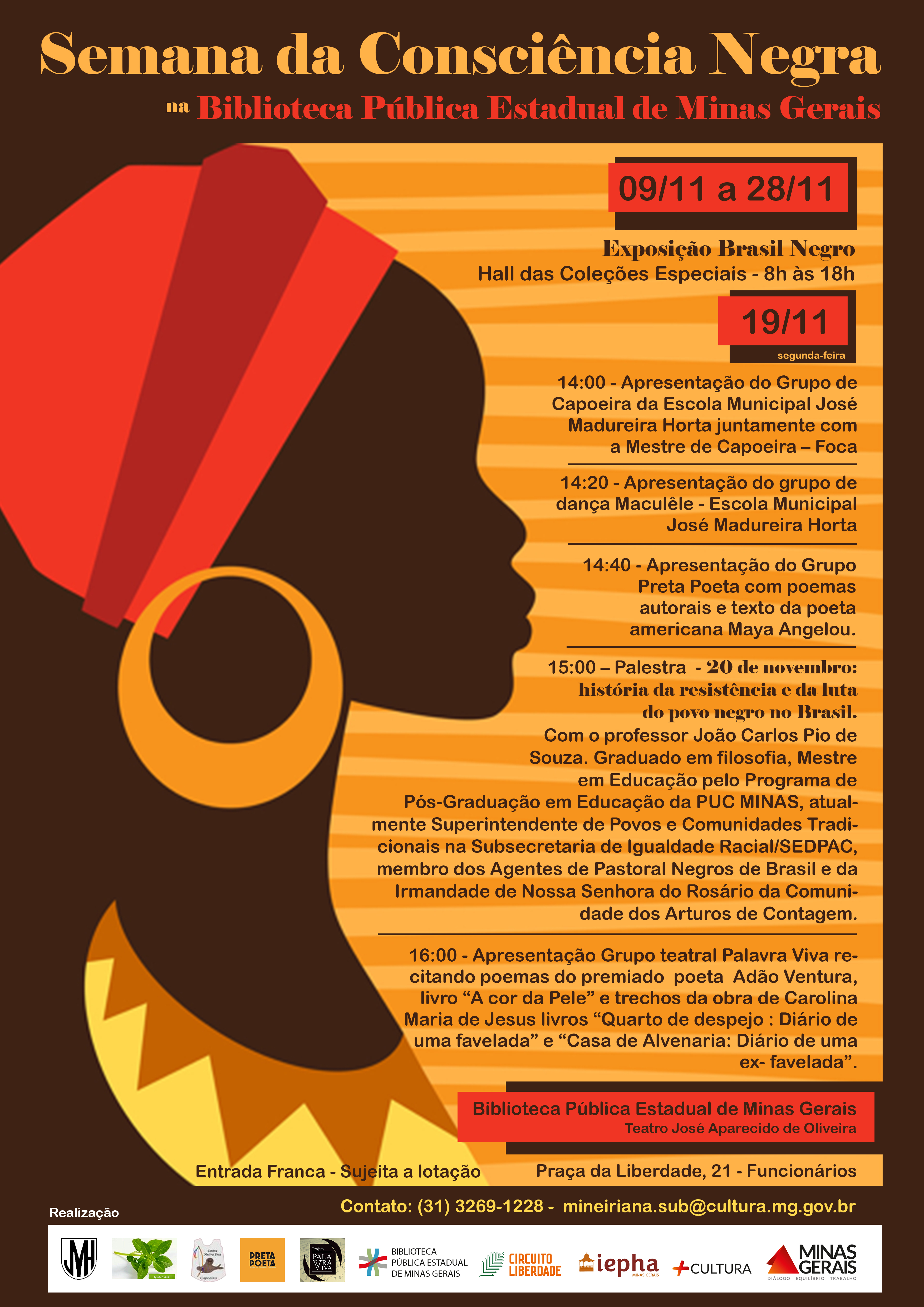 15:00 - Palestra - 20 de novembro: história da resistência e da luta do povo negro no Brasil.Com o professor João Carlos Pio de Souza. Graduado em Filosofia, Mestre em Educação pelo Programa de Pós-Graduação em Educação da PUC MINAS, atualmente Superintendente de Povos e Comunidades Tradicionais na Subsecretaria de Igualdade Racial/SEDPAC, membros dos Agentes de Pastoral Negros de Brasil e da Irmandade de Nossa Senhora do Rosário da Comunidade dos Arturos de Contagem.